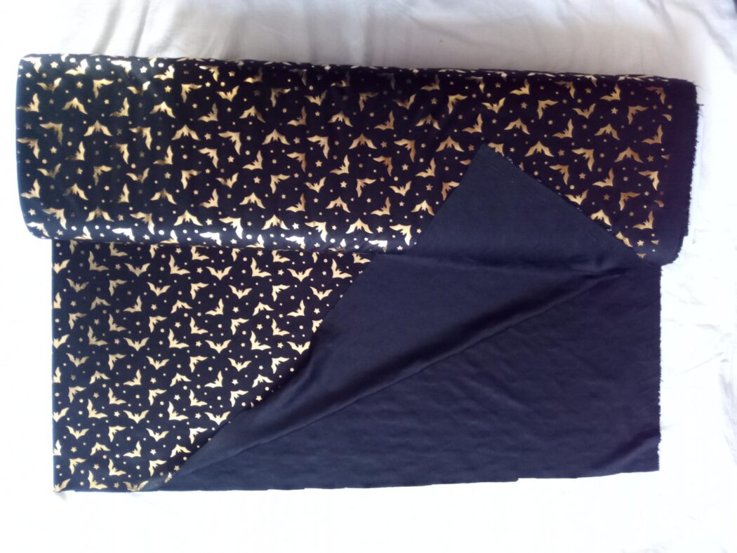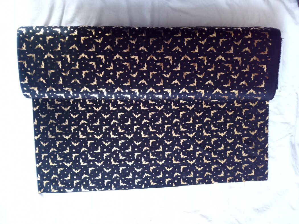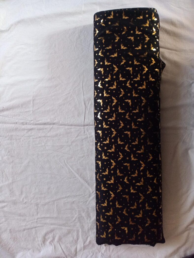 Dieser wunderschöne Polyester Jersey ist mit goldenen Fledermäusen bedruckt. Es ist der perfekte Stoff für Halloween oder Fasching. Effektvoll und glänzend ist er zugleich finster und sorgt für das richtige Ambiente.
