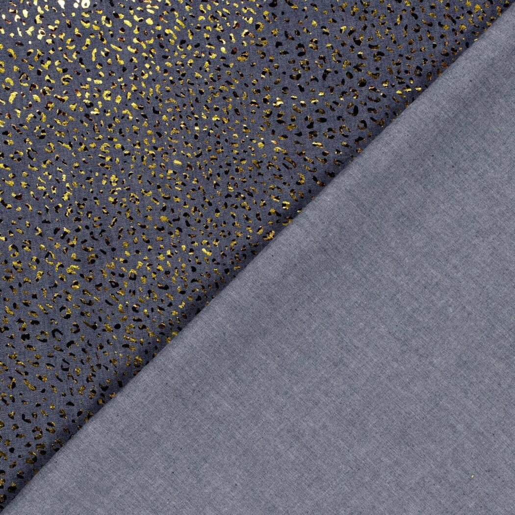 Vous obtenez un superbe tissu denim avec un imprimé feuille d’or. Le tissu imprimé léopard est parfait pour les chemisiers en jean, les robes en jean ou les pantalons. Procurez-vous ce merveilleux tissu pour votre prochain projet !