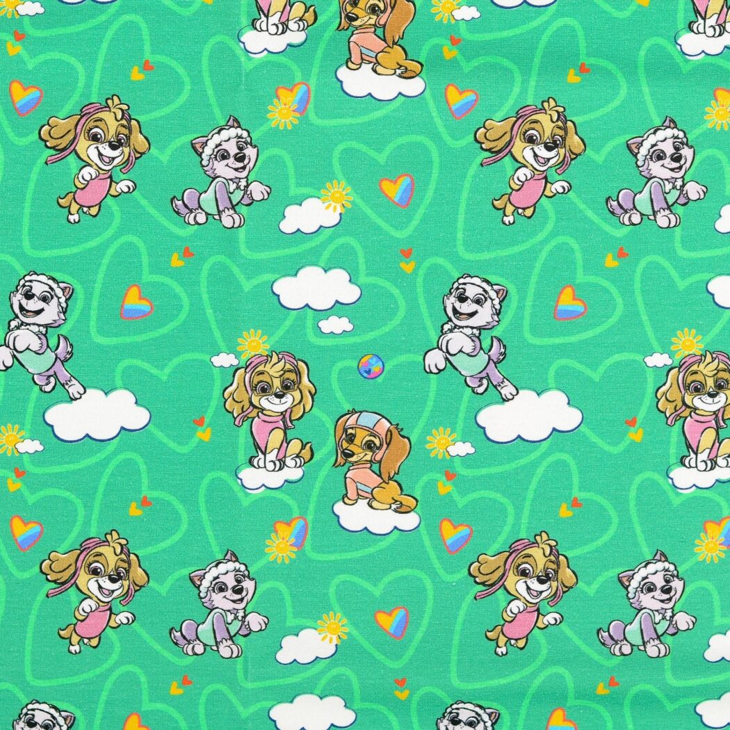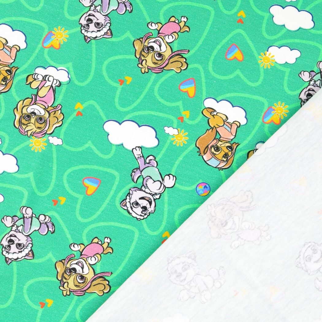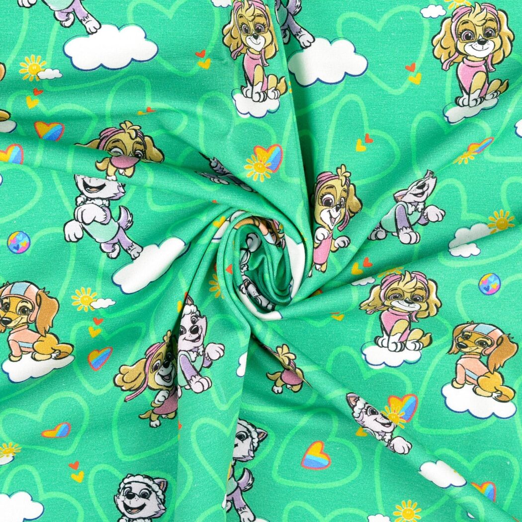 Du bekommst einen grünen Paw Patrol Baumwoll Jersey mit Skye, Everest und Liberty drauf. Der Stoff eignet sich hervorragend für T-Shirts und leichte Sommerhosen, aber auch für hübsche Kleidchen.