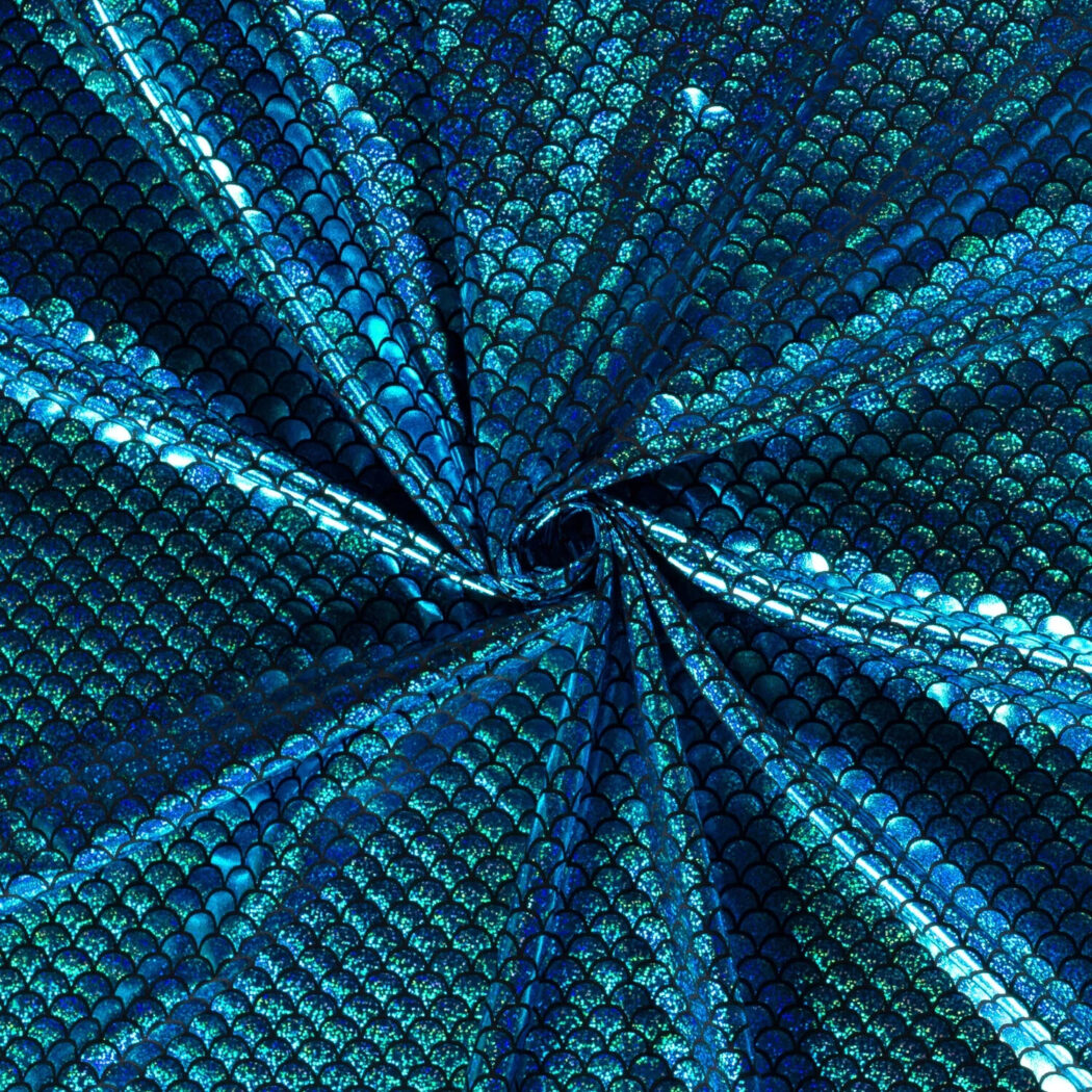 Tessuto lamé con motivo sirena / Scale nella stampa a foglio Acqua 1mx1,50m 95% poliestere 5% elastan 170 g/m² Il morbido tessuto lamé in poliestere ed elastan si distingue per la stampa a sirena blu. Cuci costumi di carnevale dal tessuto scintillante o realizza ad es. B. Le magliette o gli abiti abbinati sono qualcosa di molto speciale.