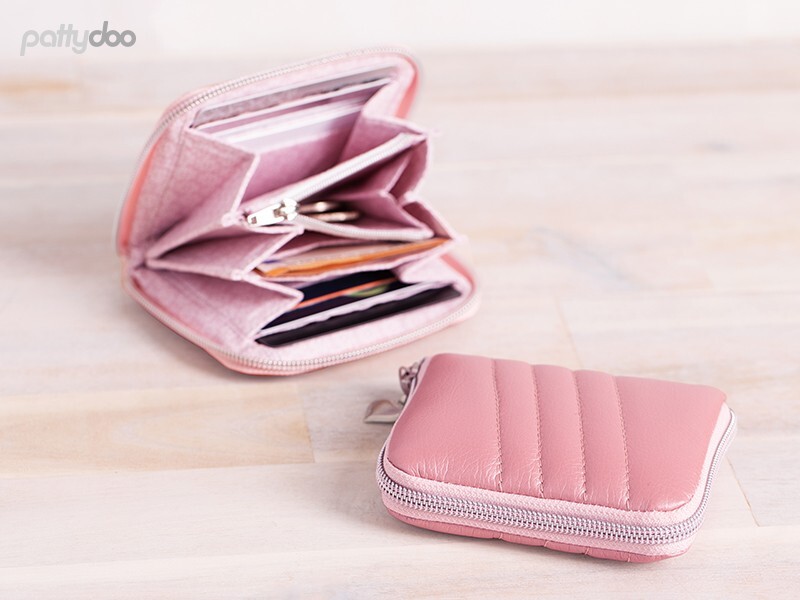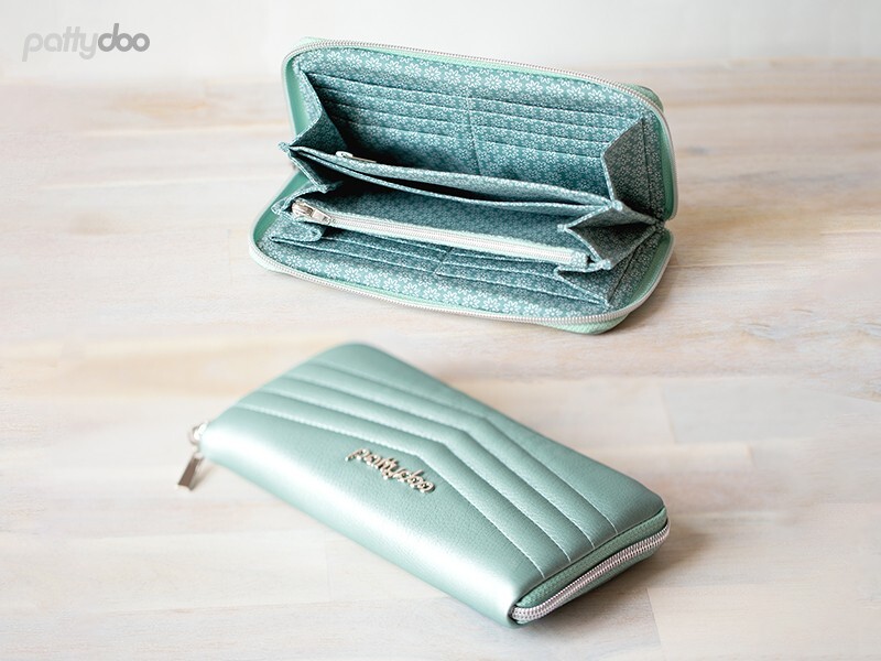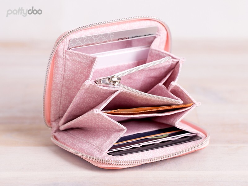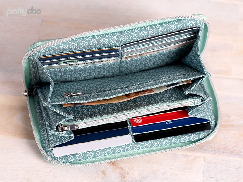 Con el patrón “Molly & Polly” obtienes dos tamaños de billetera en un solo paquete. Las carteras confeccionadas incluyen 16 compartimentos para tarjetas, un compartimento para monedas con cremallera y una cremallera circunferencial.