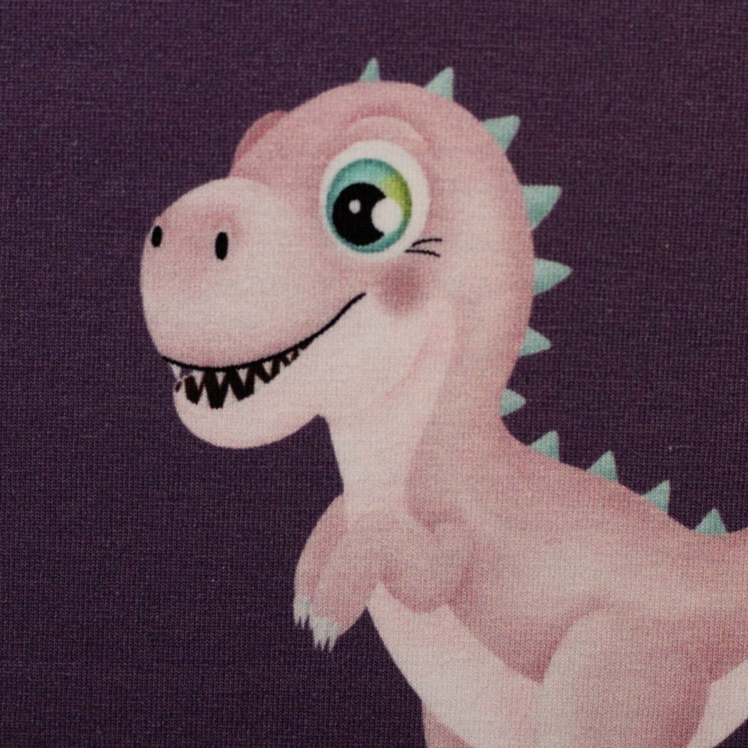 Obtendrás un bonito y suave jersey de algodón que puedes usar para coser camisetas, vestidos y pantalones. El patrón consta de un dinosaurio y corazones.