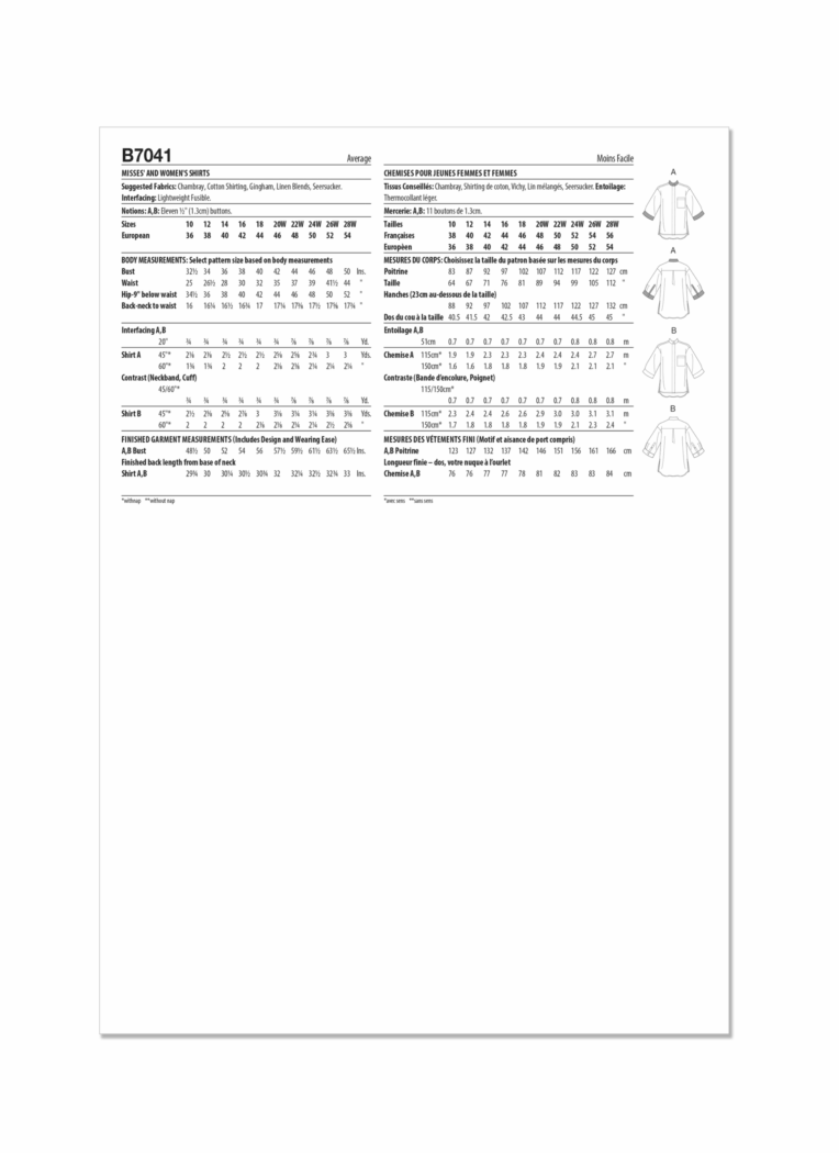 Geeignet für Chambray, Baumwoll- Hemdstoff, Gingham, Leinenmischungen, Seersucker. Einlage: Leichtes Fixiermaterial.