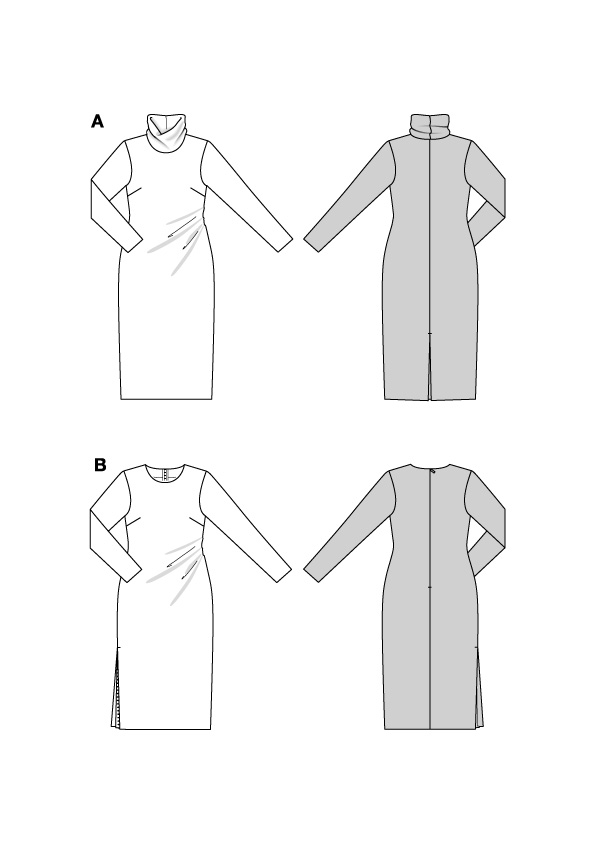 Du kannst zwischen zwei Versionen wählen. Variante A punktet mit einem hohen Rollkragen und einer ruhigen, fließenden Optik. Variante B kommt mit einem klassischen Rundhalsausschnitt und einem seitlichen Schlitz, der dem Kleid eine moderne Note verleiht.