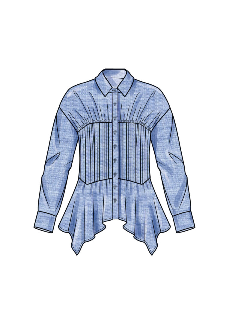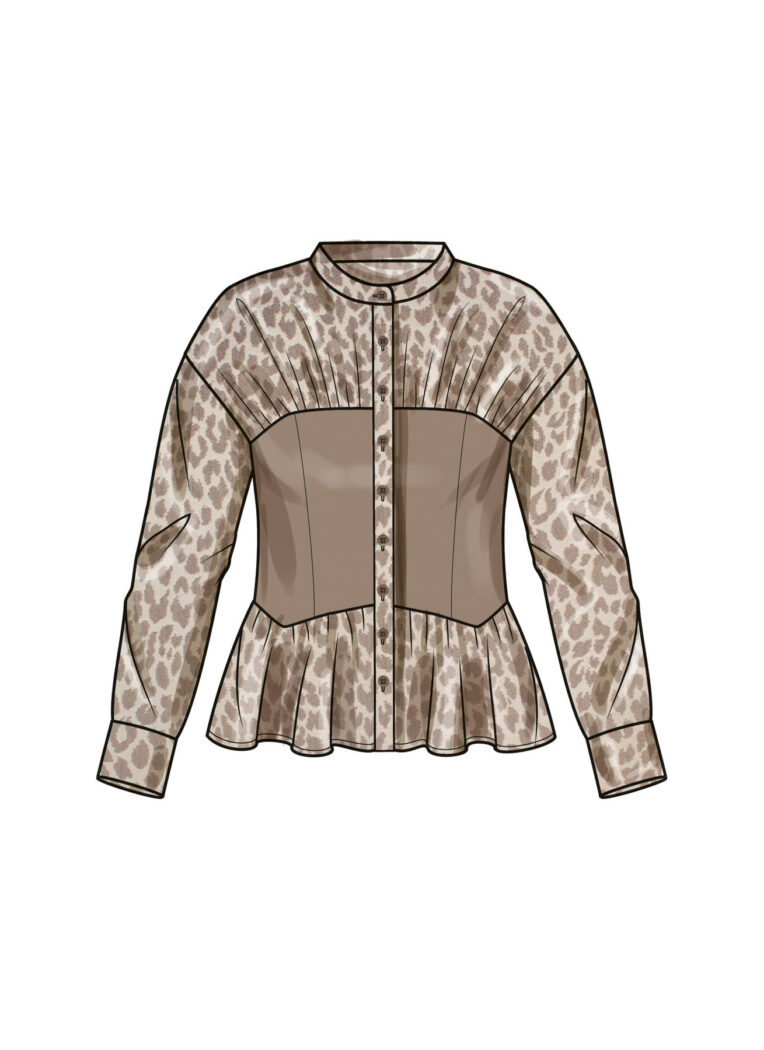 Mit dem Schnittmuster Simplicity S9821 nähst du dir eine ausdrucksstarke Bluse mit femininer Silhouette und raffinierten Details. Die taillierte Form entsteht durch ein gerafftes Mittelteil, das optisch streckt und zugleich angenehm sitzt. Die durchgehende Knopfleiste und der klassische Kragen geben der Bluse eine zeitlose Basis, die du vielseitig kombinierst.