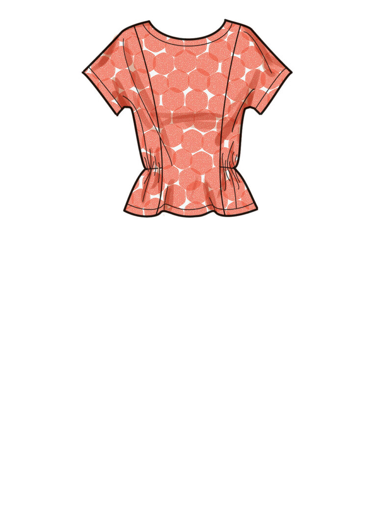 Das Oberteil ist in Hüft- oder Cropped-Länge gestaltet und bietet mehrere Ärmelvarianten. Prinzessnähte und ein elastischer Bund formen eine feminine Silhouette mit leichtem Peplum-Effekt.
