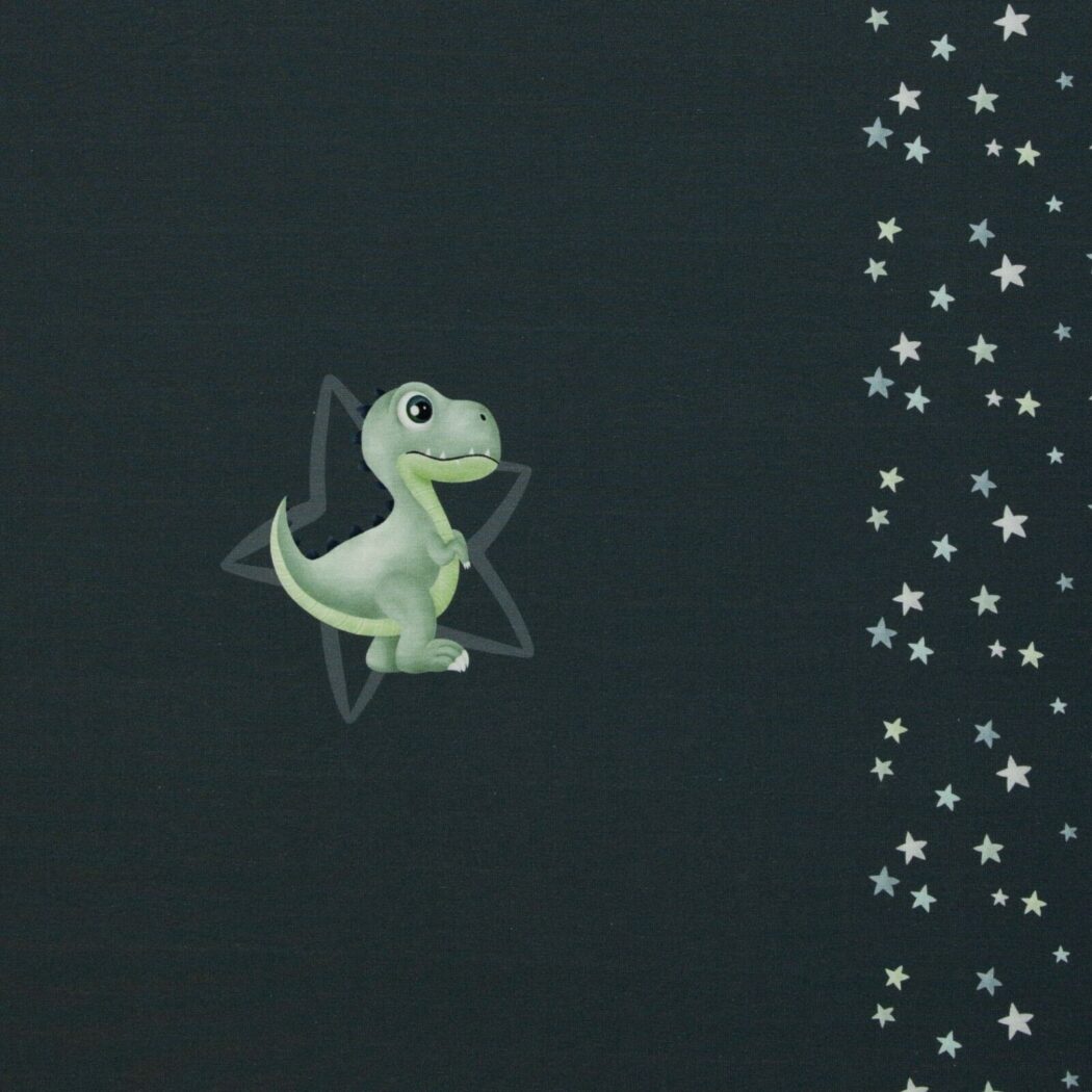 Du bekommst einen schönen weichen Baumwolljersey, mit dem du T-Shirts, Kleider und Hosen nähen kannst. Das Muster besteht aus einem Dino und Herzchen.