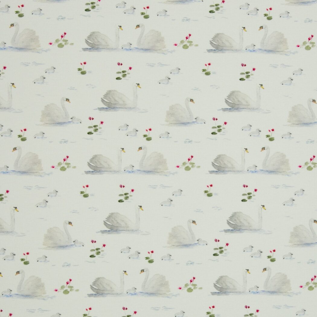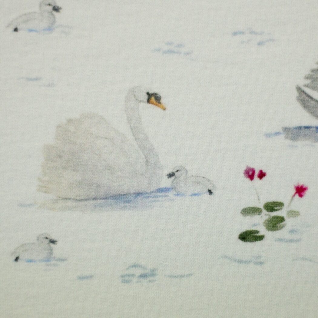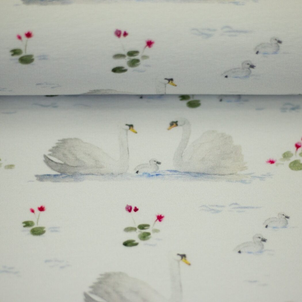 Du bekommst einen schönen weichen Baumwolljersey, mit dem du T-Shirts, Kleider und Hosen nähen kannst. Das Muster besteht aus wunderschönen Schwänen.