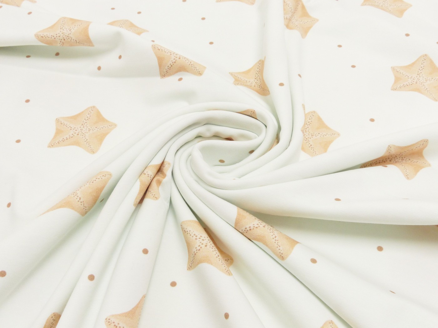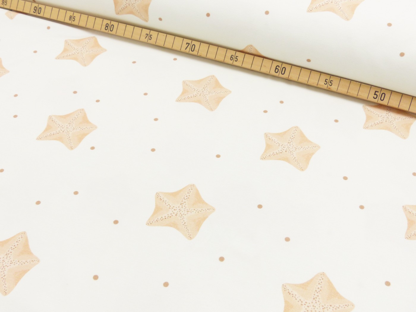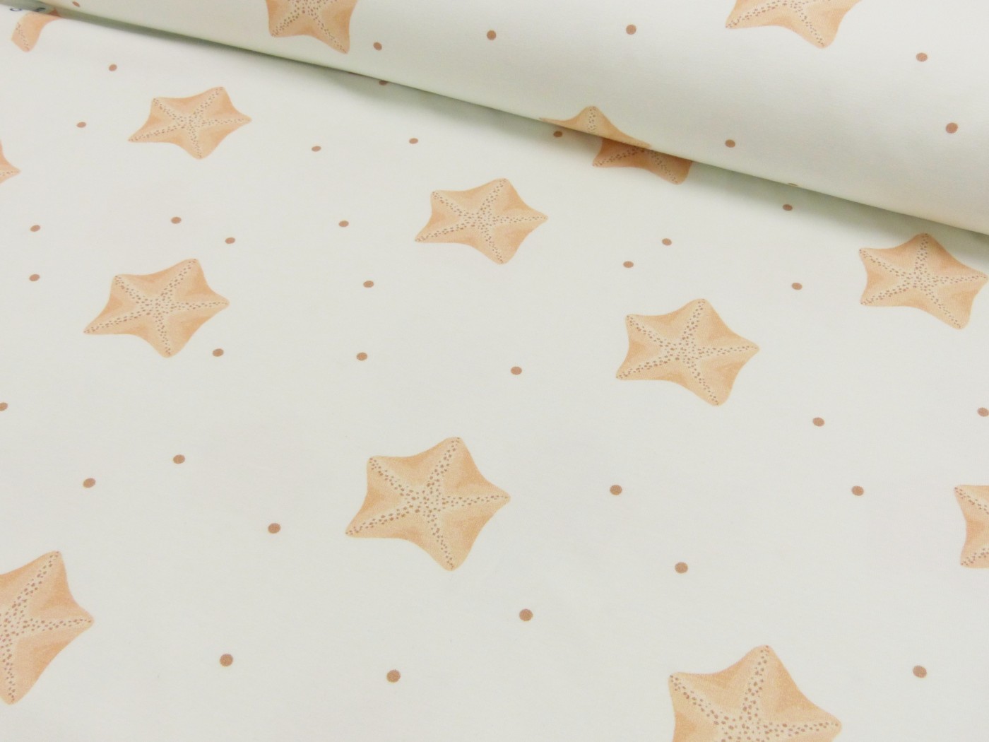 Du bekommst einen schönen weichen Baumwolljersey, mit dem du T-Shirts, Kleider und Hosen nähen kannst. Das Muster besteht aus kleinen Seesternen.