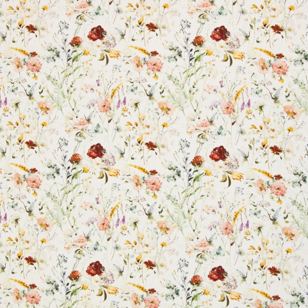Du bekommst einen bunte Baumwollwebware, mit der du T-Shirts, Kleider und Hosen nähen kannst. Das Muster sind wunderschöne Blumen.